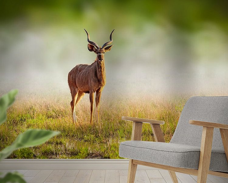 Dieses Werk zeigt einen Großen Kudu (Tragelaphus strepsiceros), bock der im Morgenlicht in einem Sumpf steht. Etwas Morgennebel hängt noch über dem Sumpf. Die große Antilope hebt sich gut von dem unscharfen Hintergrund ab. Der Kudu blickt direkt in die Kamera.