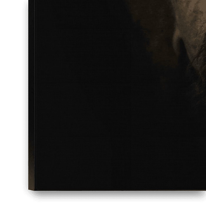 Dieses Löwenkunstwerk zeigt das Porträt eines Löwen mit durchdringendem Blick. Die schöne braune Farbe dieses beeindruckenden Raubtiers hebt sich wunderbar vom schwarzen Hintergrund ab.