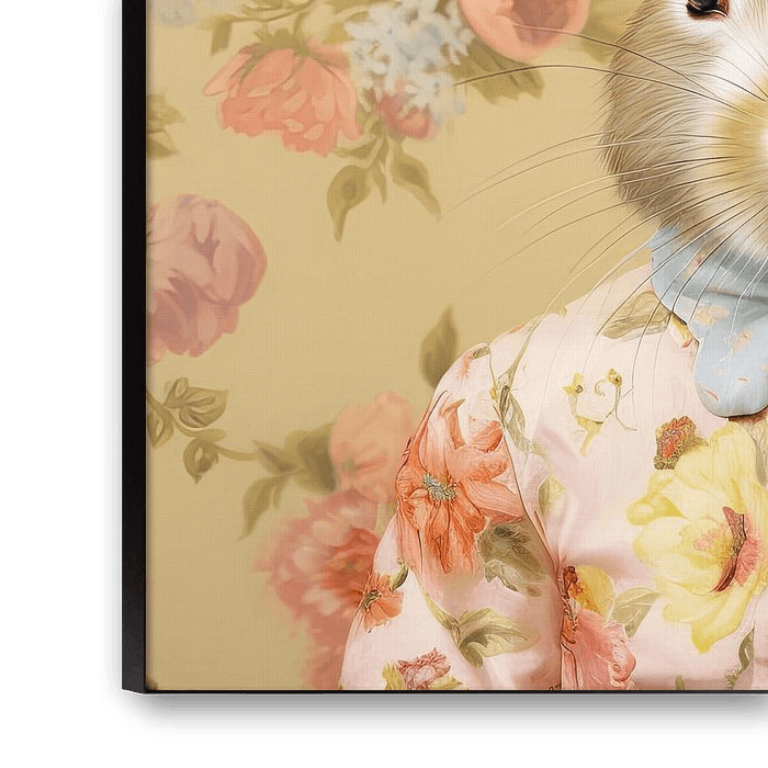 In diesem charmanten Tierporträt ist Frau Kaninchen meisterhaft eingefangen. Gekleidet in ein bezauberndes Blumenkleid, strahlt dieses flauschige Bauernhoftier zeitlose Eleganz aus.