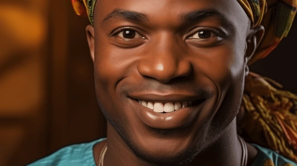 Porträt eines lachenden afrikanischen Mannes mit buntem Kopftuch