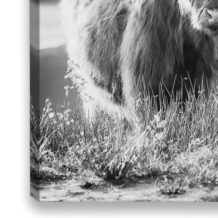 Schottischer Highlander fotografiert in Brabant's Thirst. Wunderschöne Tiere mit großen Hörnern. Sie sind da draußen in der Wildnis. Schön zu fotografieren, besonders bei schwacher Sonne und Gegenlicht wie in diesem Bild. Bearbeitet in Schwarz-Weiß.