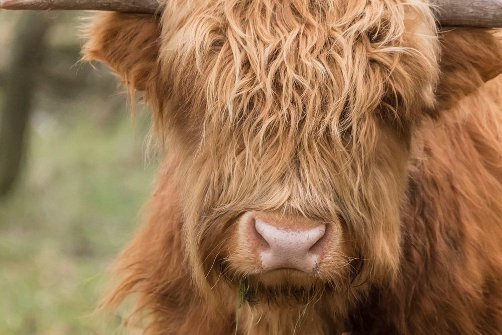 Nahaufnahme eines schottischen Highlanders im Herbst im Naturschutzgebiet Huis ter Heide in Nordbrabant in den Niederlanden. Das Gebiet wird von Natuurmonumenten verwaltet.