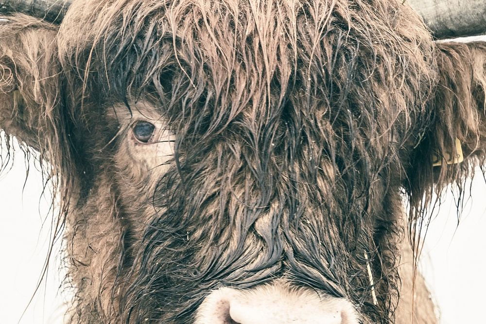 Porträt eines schottischen Hochlandrindes im Schnee während des Winters. Die schottischen Hochlandrinder werden beim Naturschutz in der Veluwe eingesetzt, um sicherzustellen, dass die Heideflächen nicht zu dicht wachsen.