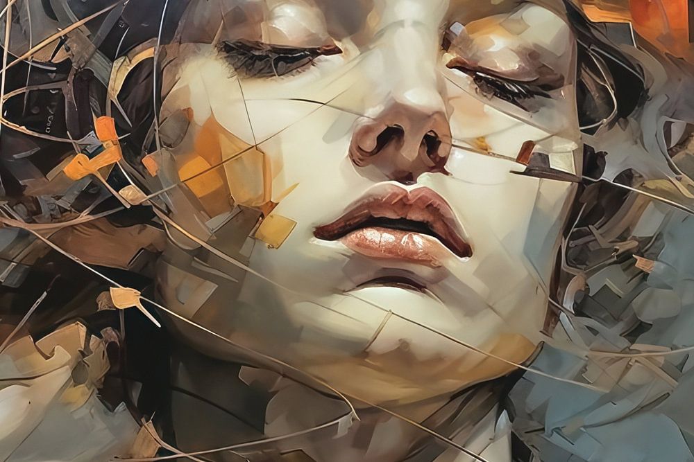 Obwohl die Schaffung von Kunstformen durch künstliche Intelligenz von vielen als umstritten angesehen wird, kann sie nicht mehr aus allen Bereichen des Lebens geleugnet werden. In der Tat arbeitet man als Fotograf schon seit Jahren mit einer Form davon, seit die Fotografie digital geworden ist. Für mich als Fotograf ist es eine Technik, die einfach Möglichkeiten bietet, und ich sehe sie als ein Werkzeug, um kreative Ideen zu entwickeln. Ich muss allerdings sagen, dass ich keine Chatbots einsetze, sondern rein auf der Basis meiner eigenen Texte arbeite, oder ich verwende meine eigenen vorhandenen Fotos als Referenz, mit der der Bot experimentieren kann. Oft verwende ich auch generierte Bilder in Kombination oder erstelle mit ihnen völlig neue digitale Bilder. Für diese Serie habe ich den Stil eines spanischen Malers namens Royo verwendet, der mich und die Idee der strukturierten Arbeit fasziniert. Wegen des Royo-Stils taucht das Porträt in dieser Form immer wieder auf. Ich selbst habe die Serie aus Platzgründen in etwas kleinerem Format zu Hause an der Wand hängen, aber in groß sind sie großartig.