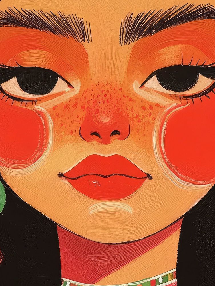 Buntes grafisches Porträt einer Frau mit rosa Wangen.