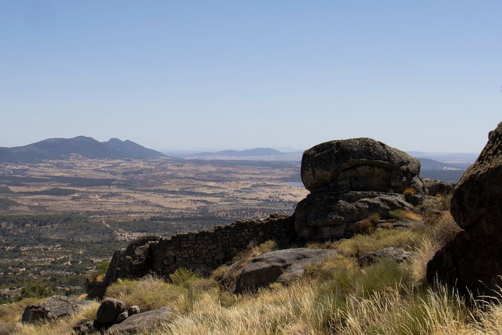 Dieses Bild zeigt die Landschaft um Monsanto in Portugal mit Bergen, weiten Tälern, großen Felsbrocken, die für diese Region typisch sind, und der lokalen Flora. All dies in einem mediterranen Klima mit strahlend blauem Himmel und viel Sonnenschein.