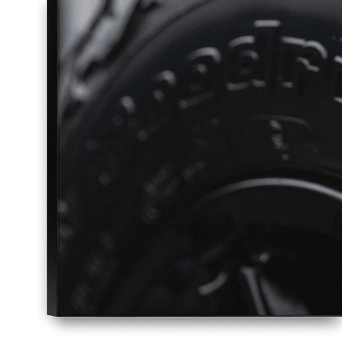 Die grobe Profilierung eines Reifens unter einem robusten Jeep.