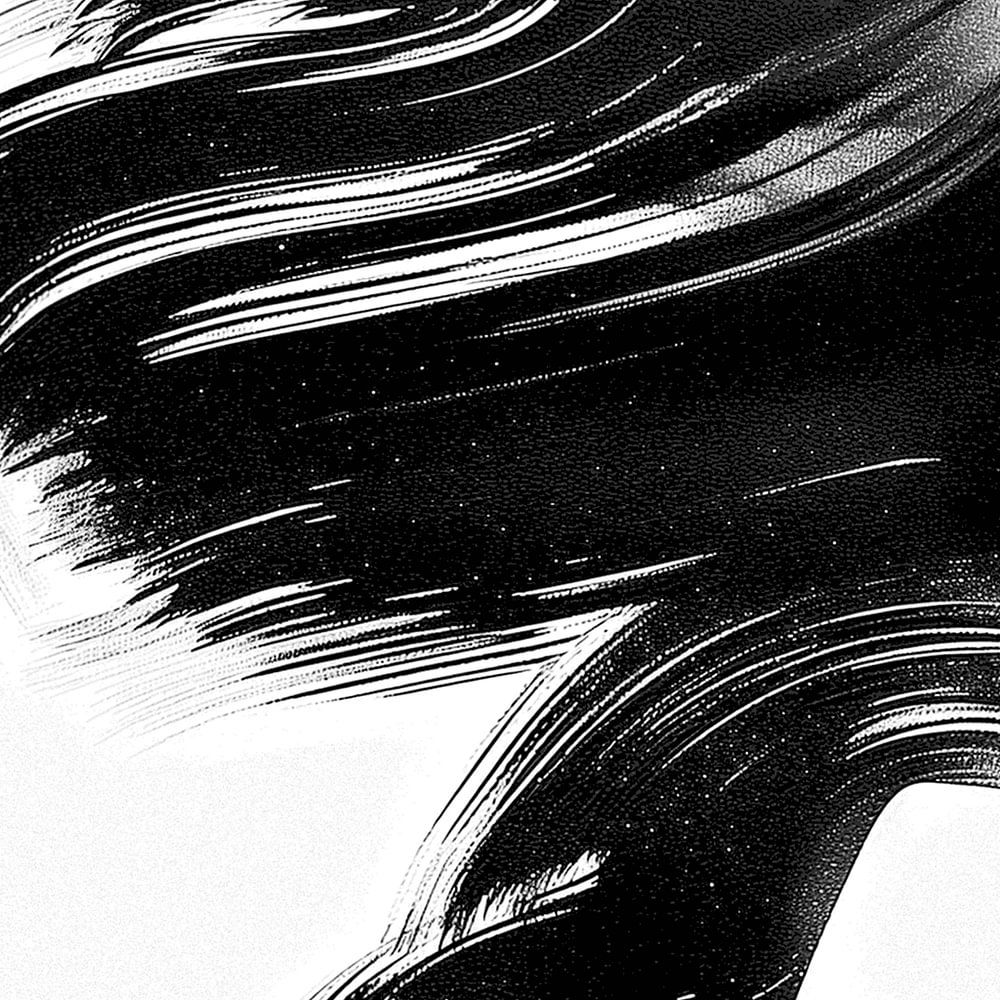 Grafische Silhouette eines weiblichen Profils, zusammengesetzt aus dynamischen schwarzen Pinselstrichen vor einem hellen Hintergrund. Die Pinselstriche sind ausdrucksstark und vermitteln ein Gefühl von Bewegung und Flüssigkeit, so als würde sich die Figur gleich verwandeln oder mit ihrer Umgebung verschmelzen. Der Kontrast zwischen Schwarz und Weiß erzeugt einen starken visuellen Effekt und hebt die eleganten Formen des weiblichen Profils hervor.