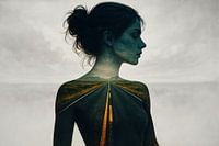 Diese Komposition zeigt eine Silhouette einer Frau, in der sich eine endlose Straße in den Horizont auflöst. Die glatte Mittellinie des Asphalts schneidet zum Fluchtpunkt, während leichter Nebel und ein sanft bewölkter Himmel eine ruhige, verträumte Atmosphäre schaffen. Kühle Grautöne und gedämpfte Grüntöne sorgen für Ruhe, und ein…