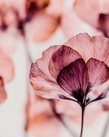 Eine zarte Nahaufnahme von durchscheinenden Blütenblättern in Rosa und tiefem Pflaumenblau mit einem verträumten Weichzeichnerhintergrund.
