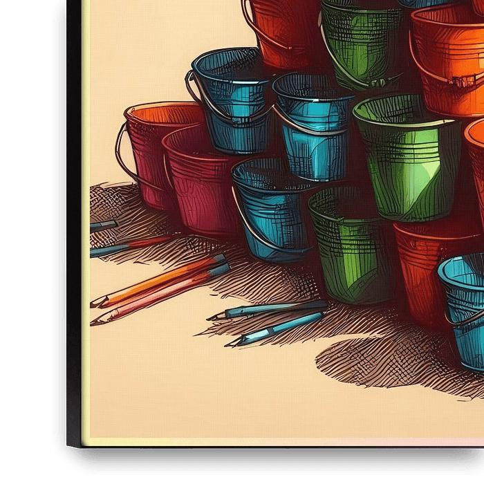 Bestelle diese Illustration Pyramide aus bunten Eimern von Hey Art! als Reproduktion auf Leinwand, Alu-Dibond, als Poster, Fototapete oder Acrylglasbild.