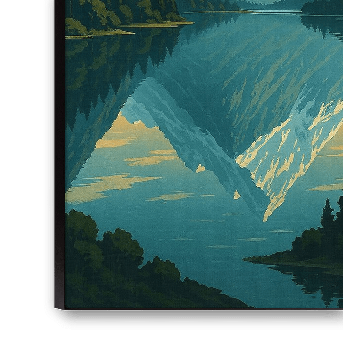 Diese atemberaubende Illustration von Queenstown fängt die heitere Magie der neuseeländischen Südalpen im klassischen Art-déco-Reiseplakatstil ein. Hoch aufragende schneebedeckte Gipfel erheben sich über einem vollkommen stillen See, der die gesamte Szene kristallklar widerspiegelt. Das glatte, spiegelglatte Wasser reflektiert jeden Bergrücken, jede Schneekante und jedes Gefälle der Berge und schafft so eine visuelle Harmonie, die friedlich, majestätisch und fast traumhaft wirkt.