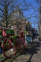 Zwei mit Pflanzen geschmückte Fahrräder sind am Geländer des Vrouwenregt im Zentrum von Delft abgestellt. Im Hintergrund ist die Nieuwe Kerk zu sehen, die für ihren 108 Meter hohen Turm und das Familiengrab von Oranien-Nassau bekannt ist.