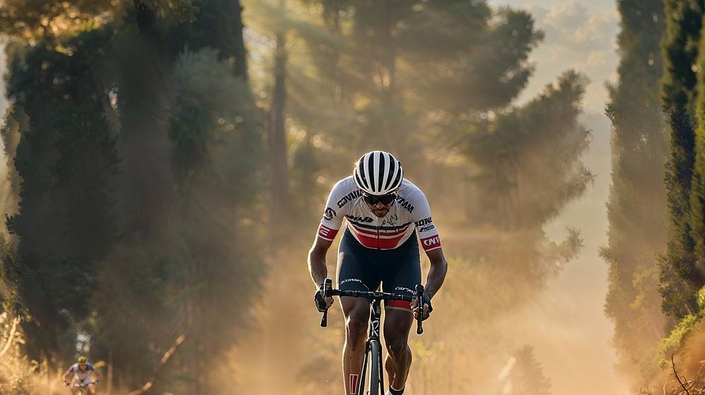 Ein beeindruckendes Radsportfoto fängt die pure Energie des Sports in einer malerischen Umgebung ein. Der in farbenfrohe Kleidung gekleidete Radfahrer rast auf einer kurvenreichen Straße durch die Luft. Die Dynamik der Bewegung wird eingefangen, während die umgebende Natur mit sanften Hügeln oder majestätischen Bergen eine atemberaubende Kulisse bietet. Das Foto strahlt Kraft, Entschlossenheit und die Pracht des Radsports aus.