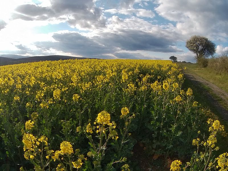 Bestelle das Foto Rapsfeld mit Baum im Frühling bei Bad Neustadt von Martin Flechsig als Reproduktion auf Leinwand, Alu-Dibond, als Poster, Fototapete oder Acrylglasbild.