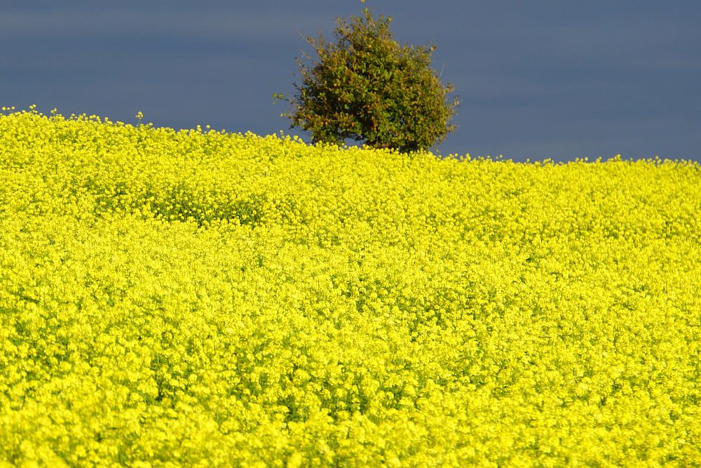 Ein leuchtend gelbes Rapsfeld füllt die ganze Landschaft aus - als hätte jemand das Sonnenlicht mit einem dicken Pinsel über den Boden gefegt. Die Blumen stehen in voller Blüte und bilden zusammen ein Farbenmeer, das den Blick automatisch bis zum Horizont führt.