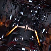 Eine Sci-Fi-Scene mit einem Tunnel in einer Raumstation, durch den eine Rakete fliegt. Mit Schärfentiefe und Bewegungsunschärfe.