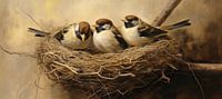Realistic Sparrows | Spatzen – Dieses realistische Kunstwerk zeigt drei Spatzen, die eng aneinandergekuschelt in einem Nest sitzen, dargestellt in warmen Erdtönen, die ein Gefühl von Ruhe und Natürlichkeit ausstrahlen. Die detailreiche Darstellung der Vögel und des Nestes, mit viel Liebe zum Detail bei Textur und Schatten, verleiht der…