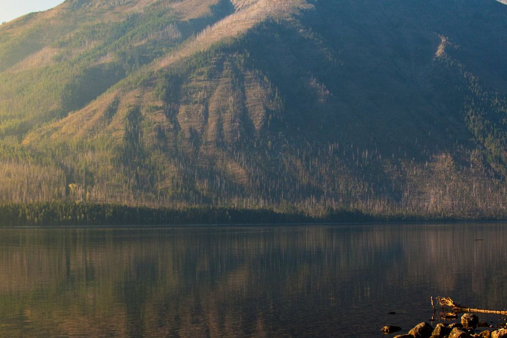 Reflexion bei Sonnenuntergang auf dem Lake McDonald, bearbeitet, um den Sonnenstrahlen mehr Kraft zu verleihen. Buntes Foto von Orange, Gelb und Grün bis hin zu den Schatten in Orange, Braun und Gelb.