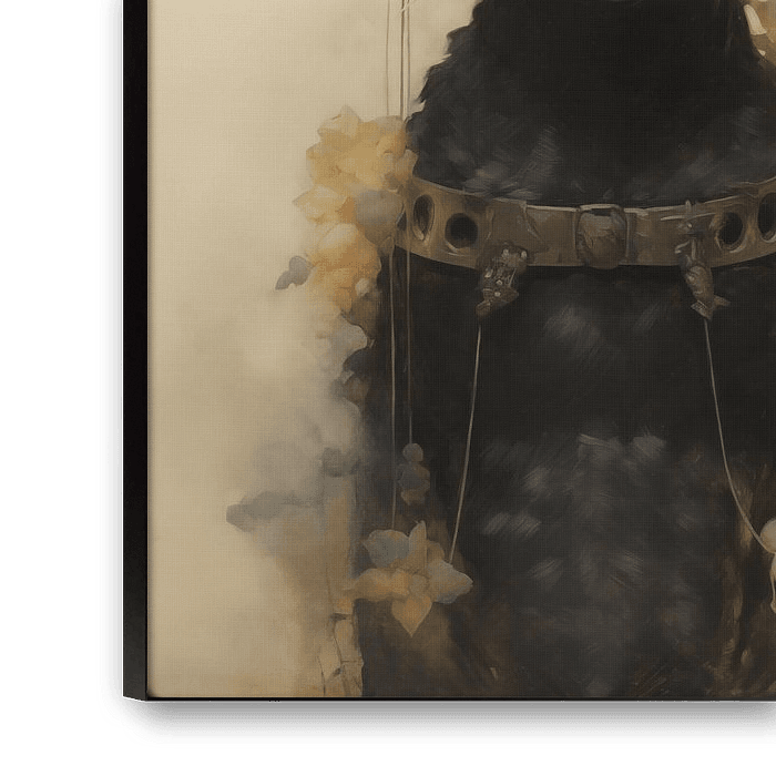 Das dunkle Fell der Katze steht in starkem Kontrast zu den pastellfarbenen Blumen und dem gedämpften Hintergrund und verleiht dem Werk Tiefe und Dimension. Die von der Katze getragene Metallrüstung deutet auf einen kriegerischen Hintergrund hin, vielleicht auf eine Hüterin alter Geheimnisse oder eine Beschützerin heiliger Orte.