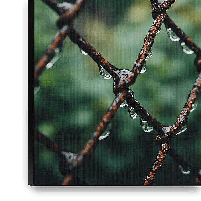 Dieses detaillierte Design fängt die Schönheit von Regentropfen ein, die sich an einem rostigen Drahtzaun festsetzen - perfekt für Liebhaber natürlicher und rauer Ästhetik. Die feinen Wassertropfen glitzern im Licht und vermitteln eine heitere Atmosphäre. Der Kontrast zwischen den nassen, glänzenden Regentropfen und dem verwitterten,…