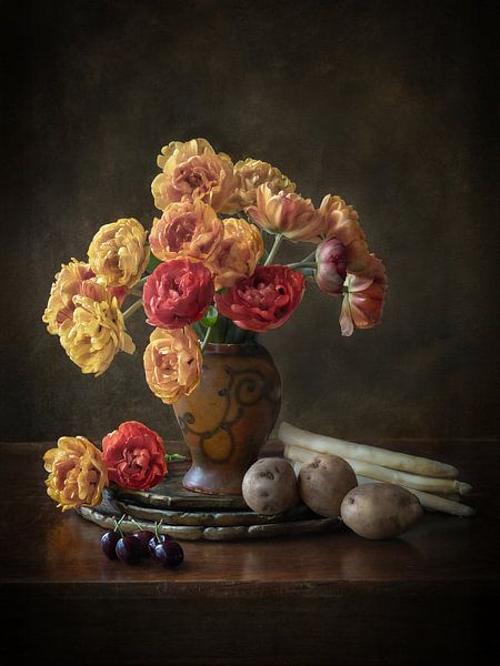 Rote und gelbe Tulpen blühen in einer Vase, umgeben von Kirschen, Kartoffeln und Spargel. Das Stillleben strahlt die reichhaltige Einfachheit und zeitlose Ruhe der „Alten Meister“ aus, die dies gerne malten.