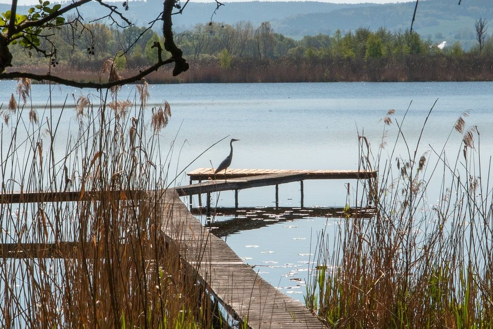 Angelsteg am Breitunger See. Ein Reiher steht auf dem Steg. Breitungen, Thüringer Wald