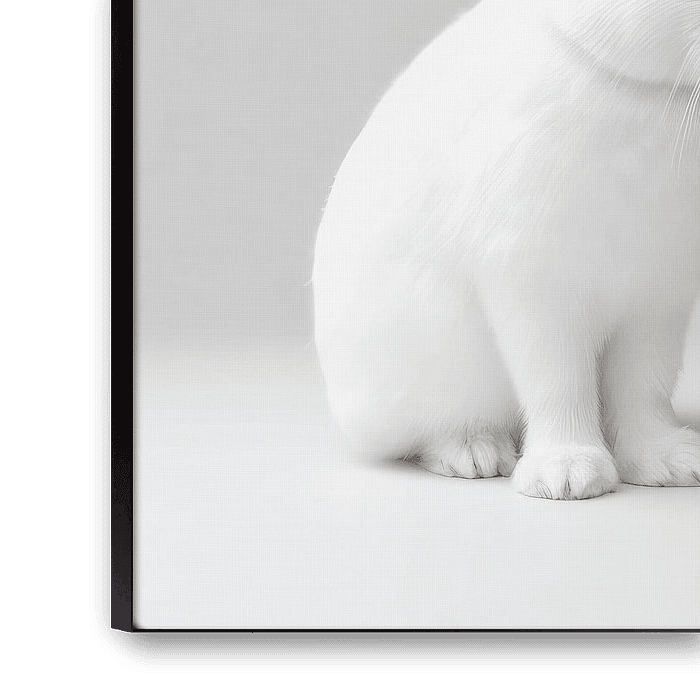 "Purity and Innocence" ist eine entwaffnende Fotografie eines weißen Kaninchens, dessen helles Fell und wachsames Auftreten dem Bild ein Gefühl von Frische und Neugier verleihen. Das Kaninchen, das in der Mitte eines makellosen weißen Rahmens steht, blickt mit großen, staunenden Augen in die Welt hinaus. Die zarten Rosatöne in den Ohren stehen in sanftem Kontrast zu der rein weißen Umgebung und unterstreichen den unschuldigen Blick dieses charmanten Tieres. Dieses Kunstwerk wäre eine anmutige und fröhliche Ergänzung für jeden Raum, ideal für alle, die einen Hauch von Reinheit und natürlicher Einfachheit in ihre Umgebung bringen wollen.