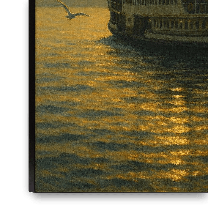Dieses stimmungsvolle und nostalgische Gemälde fängt die Romantik des Reisens auf der Bosporusstraße ein. Eine klassische Istanbuler Passagierfähre (Vapur) fährt bei Sonnenuntergang durch das ruhige Wasser, ihr weißer Rumpf und ihr hoher Schornstein heben sich von einem strahlend goldenen Himmel ab. Die Sonne steht tief und wirft einen…