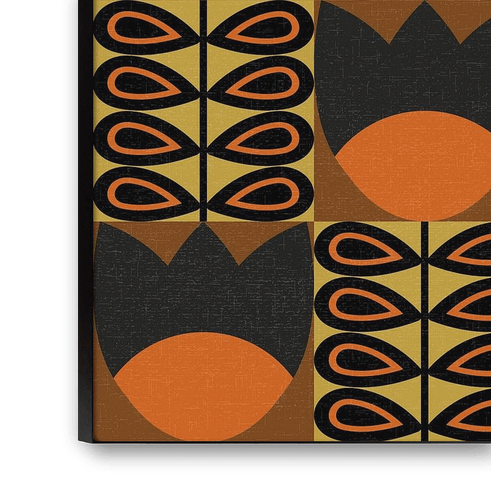 Skandinavische 70er, 60er und 50er Jahre Vintage inspirierte geometrische Kunst mit stilisierten Blumen in Retro-Farben. Nostalgische Farben und Texturen. Boho-Chic, Retro, Mid-Century Modern, skandinavisch, ländlich, neuer ländlicher Einrichtungsstil.