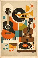 Eine stilvolle, retro-inspirierte Illustration mit klassischen Musikinstrumenten wie Gitarre, Geige, Trompete, Klaviertasten und Schallplatten. Mit warmen Farben aus der Mitte des Jahrhunderts und einer geometrischen Komposition verleiht dieses Kunstwerk modernen, Vintage- oder kreativen Innenräumen eine zeitlose musikalische Atmosphäre.
