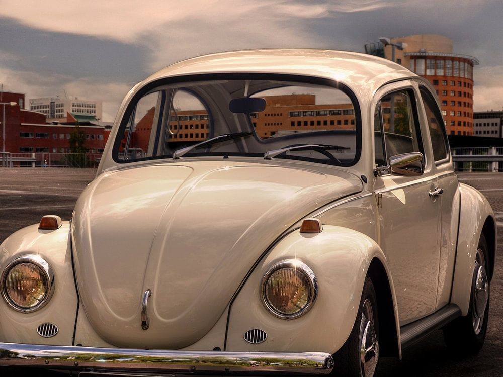 Ein klassischer Volkswagen Käfer in einer zeitlosen Straßenszene, die sorgfältig ohne moderne Elemente gestaltet wurde. Nostalgisch und stimmungsvoll.