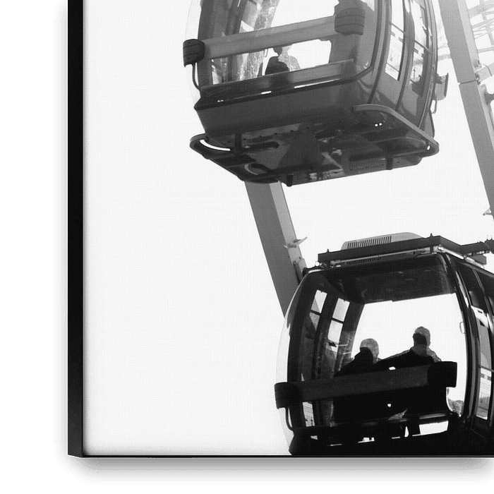 Zwart wit foto van een reuzenrad gefotografeerd met tegenlicht.