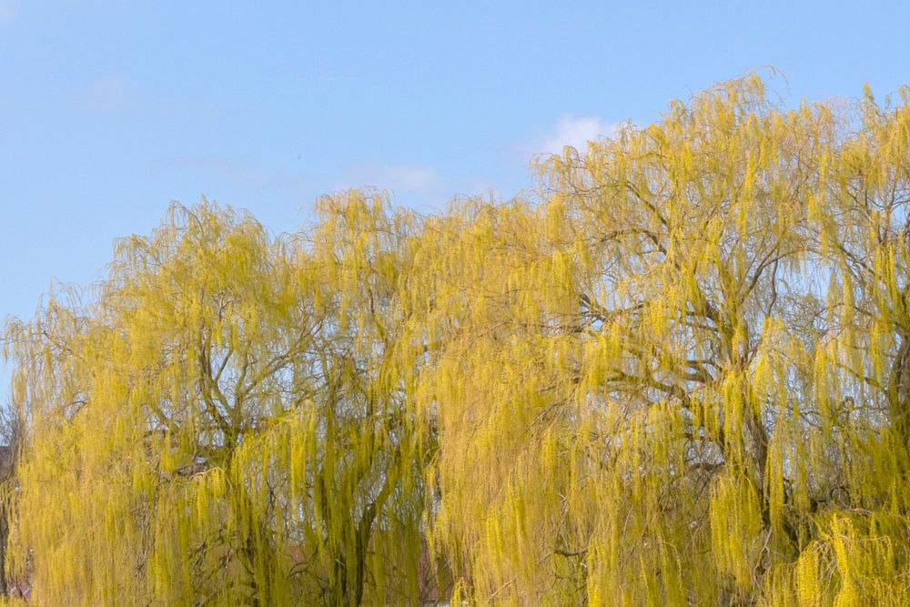 Die Rheinische Cunera-Kirche im Frühling vom Deich am Niederrhein mit der gelben Trauerweide (Salix x sepulcralis) in ihrer schönsten Form