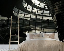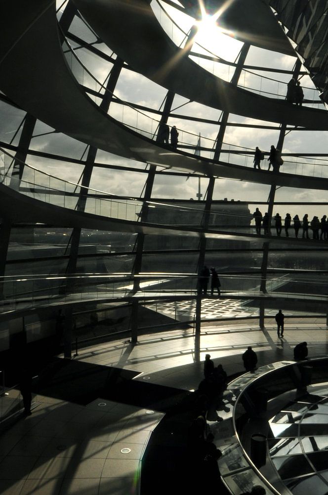 De Rijksdag in Berlijn. In dit gebouw is het parlement van Duitsland gezeteld. Het gebouw is op gezette tijden open voor bezoekers. Het is een prachtig architectonisch wonder waarin met een pad de weg naar boven gevolgd kan worden.