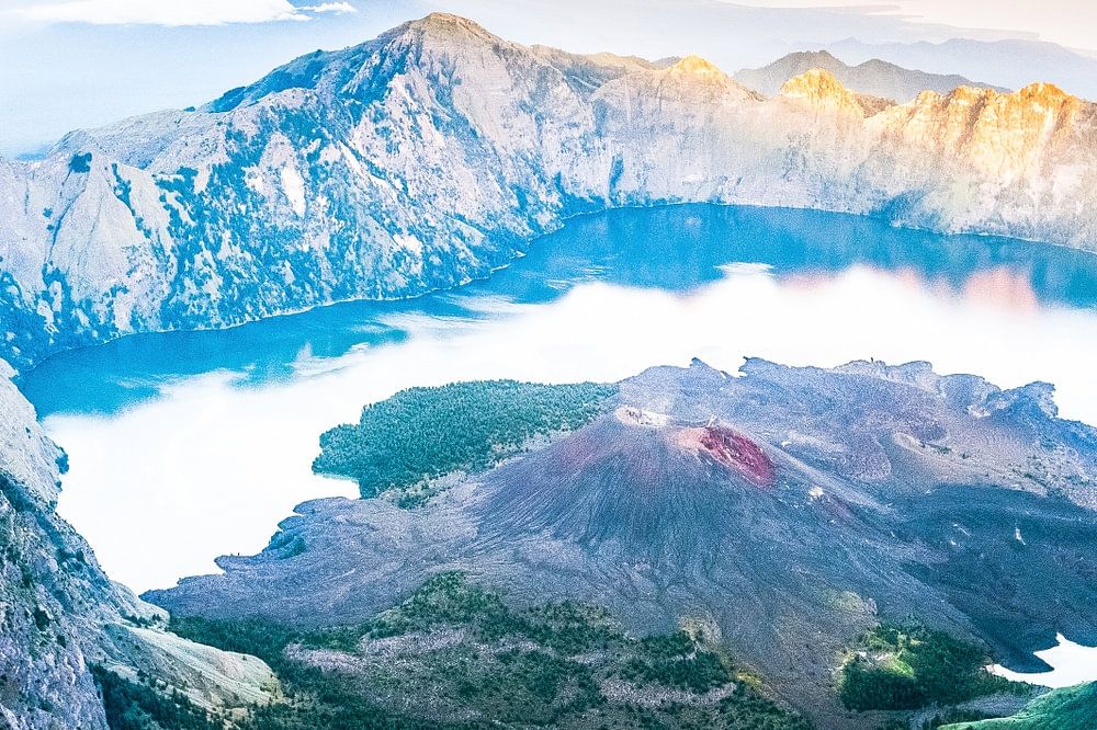 Blick vom Gipfel des Rinjani-Vulkans auf Lombok. Im Hintergrund sieht man nur die Gili-Inseln. Die Farben auf diesem Bild werden durch das erste Licht wunderschön hervorgehoben. Man kann auch den Schatten des Berges selbst deutlich sehen.