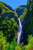 Der Risco-Wasserfall in den Bergen bei Rabaçal und die Wanderwege Levada do Risco und Levada das 25 Fontes auf der Insel Madeira an einem schönen Sommertag.
