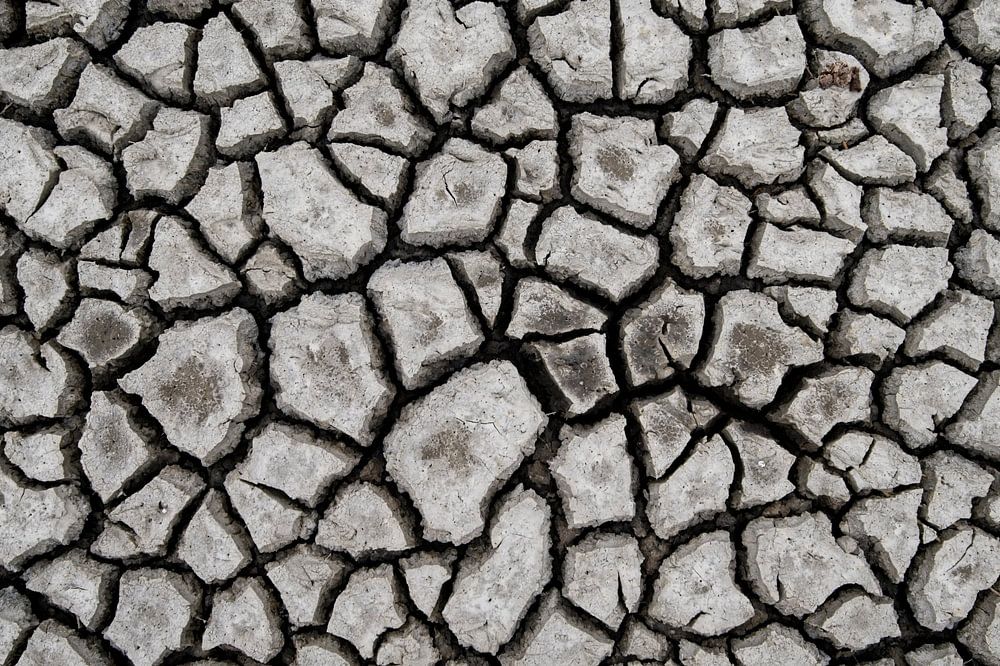 Durch die Trockenheit ist der Boden rissig geworden. Unter feuchteren Bedingungen ist dies der Boden eines Moors. Jetzt, wo das Wasser zurückgegangen und eine Weile verdunstet ist, beginnt der lehmige Boden zu brechen. Es entsteht ein fast psychedelisches Mosaik.