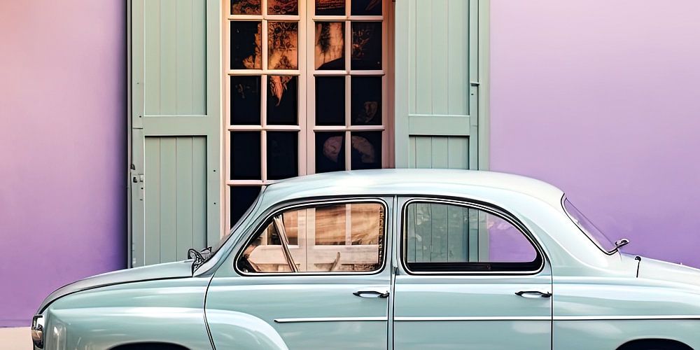 Ein Oldtimer, ein Renault Dauphine, in einem sanften Blauton parkt vor einem charmanten Haus mit einer lavendelfarbenen Wand, die Wärme und Ruhe ausstrahlt.