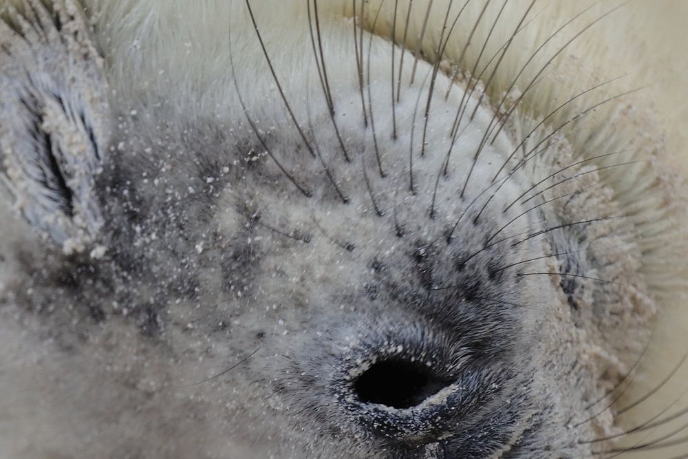 Die Robbenjungen ruhen sich am Strand aus, es dauert etwa 3 Wochen, bis ihr weißes Fell verschwindet und sie schwimmen können, und sie werden von ihren Müttern genau beobachtet.