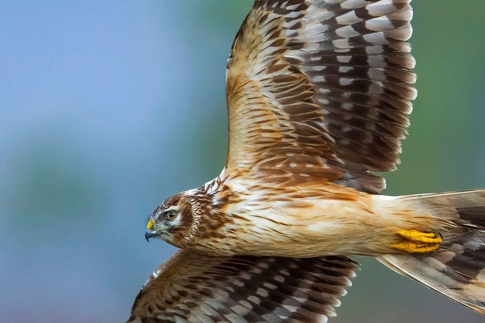 Weibliche Kornweihe im Flug in Italien. Von der Seite gesehen.
