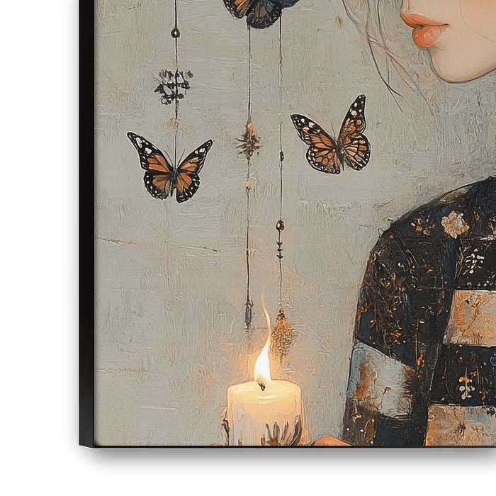 Details: romantisch, Frau, Blumen, Schmetterlinge, Porträt, Kerzenlicht, rustikal, Holzstruktur, Kunst, Gemälde