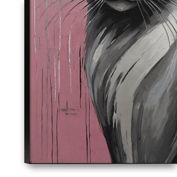 Entdecken Sie dieses zeitgenössische Meisterwerk, das den schmalen Grat zwischen tierischer Anmut und moderner Kunstfertigkeit erkundet. Der zartrosa Hintergrund kontrastiert wunderschön mit den silbernen und grauen Tönen der Katze und macht sie zu einer auffälligen Ergänzung für jeden Raum, der etwas modernes Flair gebrauchen kann. Die…