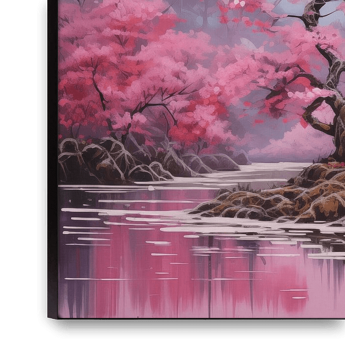 Einzigartiges japanisches Gemälde mit rosa Bäumen im künstlerischen Stil. Mit schönen Farbtönen und einem einzigartigen Design ist dies ein stilvoller Fotodruck, der in jedem Raum gut aussieht.