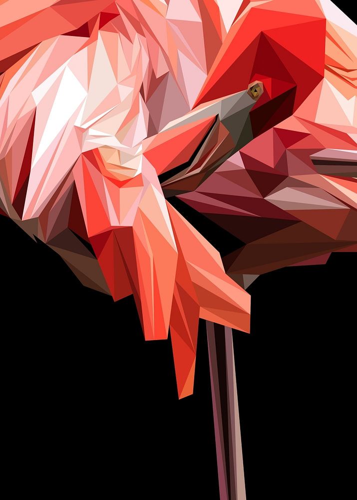 Das Bild zeigt eine lebhafte und farbenfrohe Szene mit einem Origami-Vogel. Der Vogel mit dem Namen Pink Flamengo zeigt eine auffällige Mischung aus rosa und orangefarbenen Tönen, die durch rote und weiße Akzente noch attraktiver werden.
