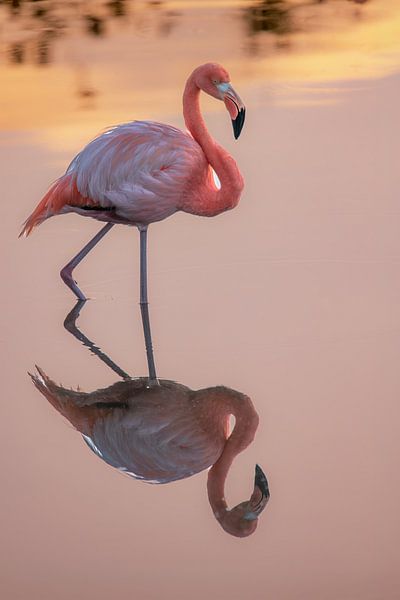 Erleben Sie die heitere Eleganz der Galápagos-Inseln mit diesem einzigartigen Porträt eines Flamingos. Eingefangen in der sanften Morgendämmerung auf der Insel Isabela, bildet der Vogel eine perfekte Symmetrie mit seinem eigenen Spiegelbild im ruhigen, verträumten Wasser. Die harmonische Mischung aus warmen Pastelltönen und dem…