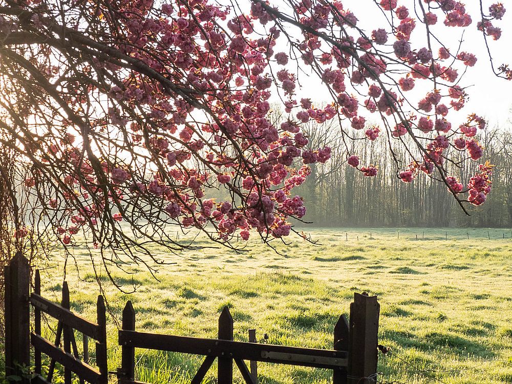 Sonnenaufgang über einer Wiese mit Kirschblüten.