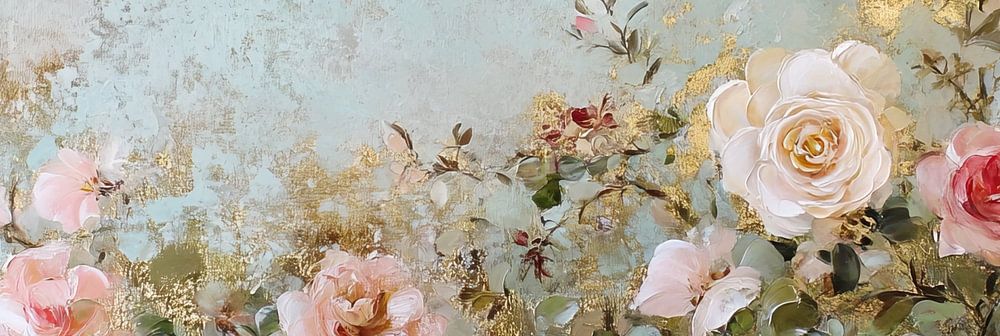 Rose Art - Dieses Blumengemälde zeigt eine lebendige Sammlung von Rosen in verschiedenen Rosa-, Weiß- und Rottönen, die durch goldene Akzente auf einem sanften blaugrauen Hintergrund ergänzt werden und eine reiche, luxuriöse und romantische Atmosphäre schaffen.