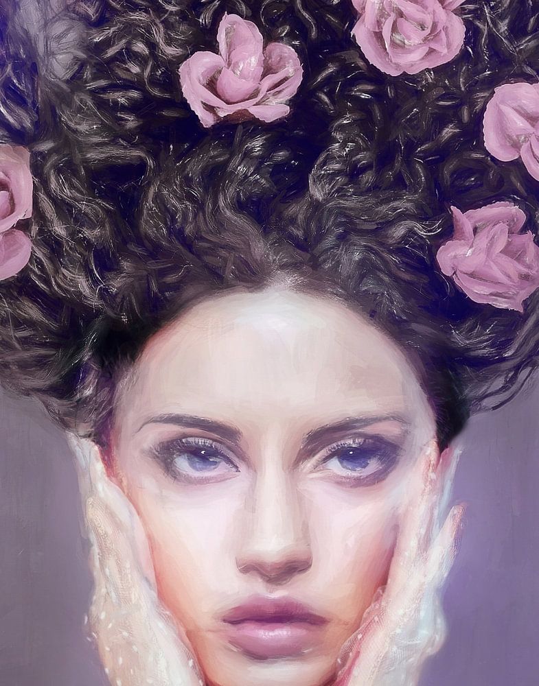 Fantasievolles Porträt in Lila- und Fliedertönen. Gemälde in Mischtechnik im Impasto-Stil. Ein Tag mit rosa Haaren :)