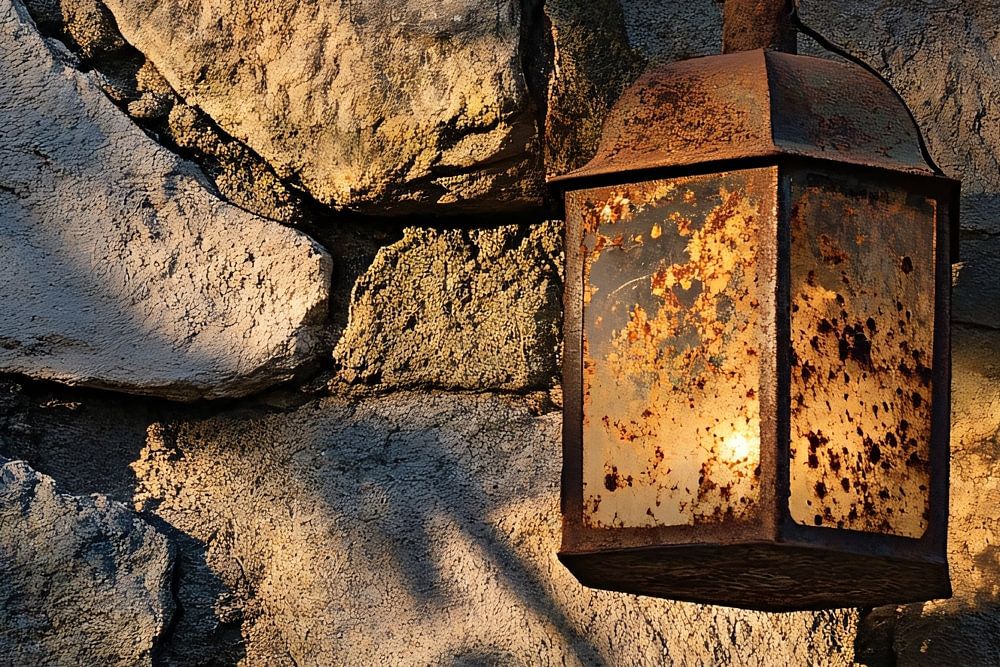 Dieses stimmungsvolle Bild zeigt eine antike rostige Laterne, die an einer Steinwand hängt. Das warme Licht, das durch die Laterne scheint, bildet einen schönen Kontrast zu dem rauen, verwitterten Steinhintergrund. Die Schatten, die von der Sonne auf die Wand geworfen werden, verleihen dem Bild eine rustikale und nostalgische Note. Dieses Bild ist perfekt für Liebhaber von Vintage und klassischer Dekoration und bringt ein Gefühl von Wärme und Geschichte in jeden Raum. Ideal als Wanddekoration, um einem Wohnzimmer, einem Flur oder einem Schlafzimmer eine einzigartige Atmosphäre zu verleihen.